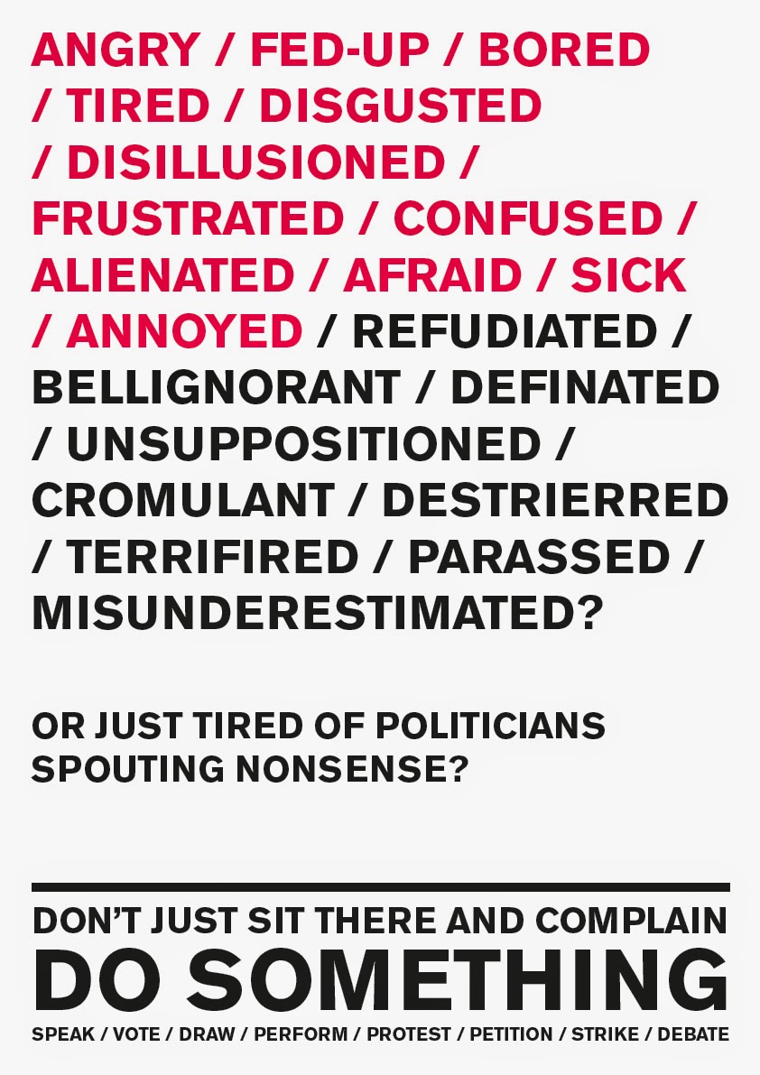 Create posters that encourage political participation through both conventional means (voting, petitioning, debating etc.) and less conventional means (protesting, activism etc.). The posters should not place emphasis on either conventional or unconventional means of participation, but rather should motivate the audience to simply want to get involved. |